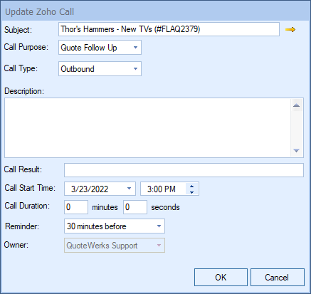 When saving a quote in QuoteWerks, QuoteWerks will create a Zoho CRM Activity so you can track your Quote Follow-up Call activities.