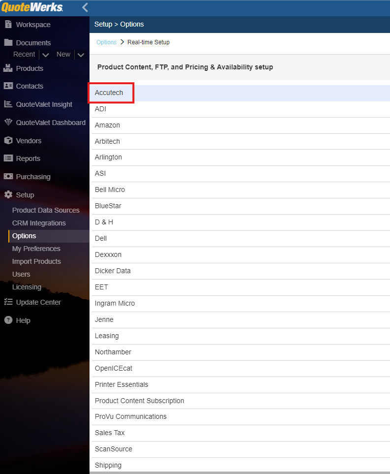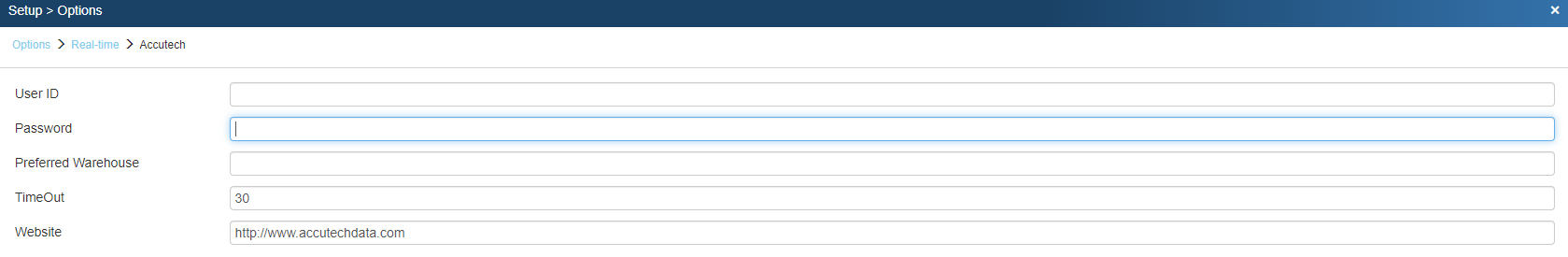 1. To setup Accutech Real-time pricing and availability navigate to Setup > Options > Real-time Setup and select Accutech.