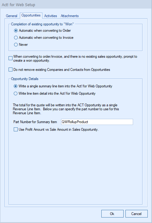 ACT! for Web Opportunities require part numbers for all line items. As such, if you choose this option, you will need to specify a part number in the “Part Number for Summary Item” field. This is the part number that will be assigned to the summary item in the Products and Services tab of the ACT! for Web Opportunity window.