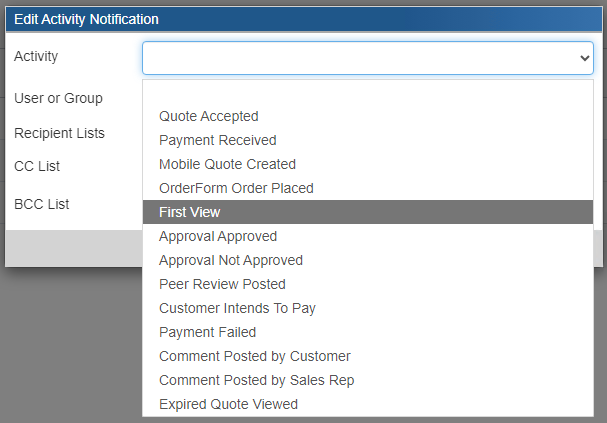 To set up the notifications for other users first choose your activity. You can choose from Quote Acceptance, Payment Received, Mobile Quote Created, OrderForm Order Placed, First View, Approval Approved, Approval Not Approved, and Peer Review Posted, Customer Intends to Pay, Payment Failed, Comment Posted by Customer, Comment Posted by Sales Rep, Expired Quote.