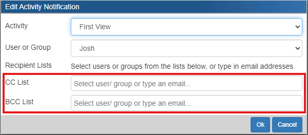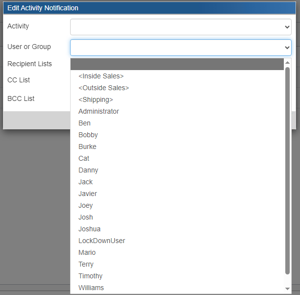 The final step includes choosing where you would like the notifications to go. There are two options a CC list and a BCC list. For both you can select a group or single user in QuoteWerks from the drop-down box.