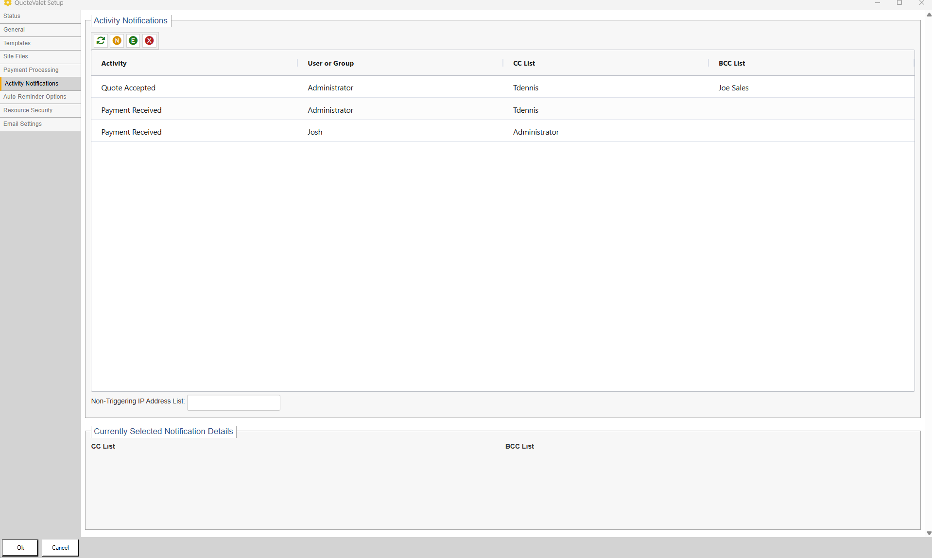The Activity Notifications Tab enables users to specify who receives the QuoteValet Notifications for key QuoteValet events. Events include when a quote has been accepted, when payment has been made, when a QuoteValet Mobile quote has been created, when a OrderForm order has been placed, the document first view notification, when a document is approved/not approved, and when a Peer Review comment has been posted. Users can add additional users/email addresses to receive a CC or BCC of the notification. This is especially useful for keeping the accounting department in the loop when payments are received and for keeping sales managers in the loop when quotes are accepted.
