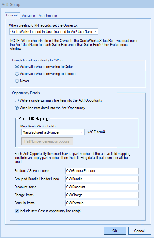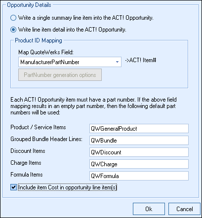 If you choose to write the individual line item details into the ACT! Opportunity, you will need to assign part numbers to use in the ACT! Opportunity that will represent the different types of QuoteWerks line items, such as Group Headers, Discount Items and Charge Items.