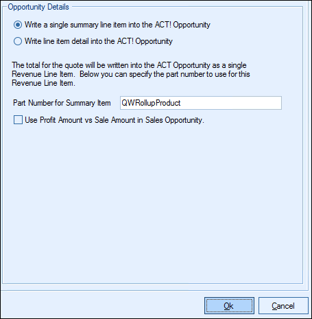 Here you have the option to write either a single summary line item or write the line item details into the ACT! Opportunity.