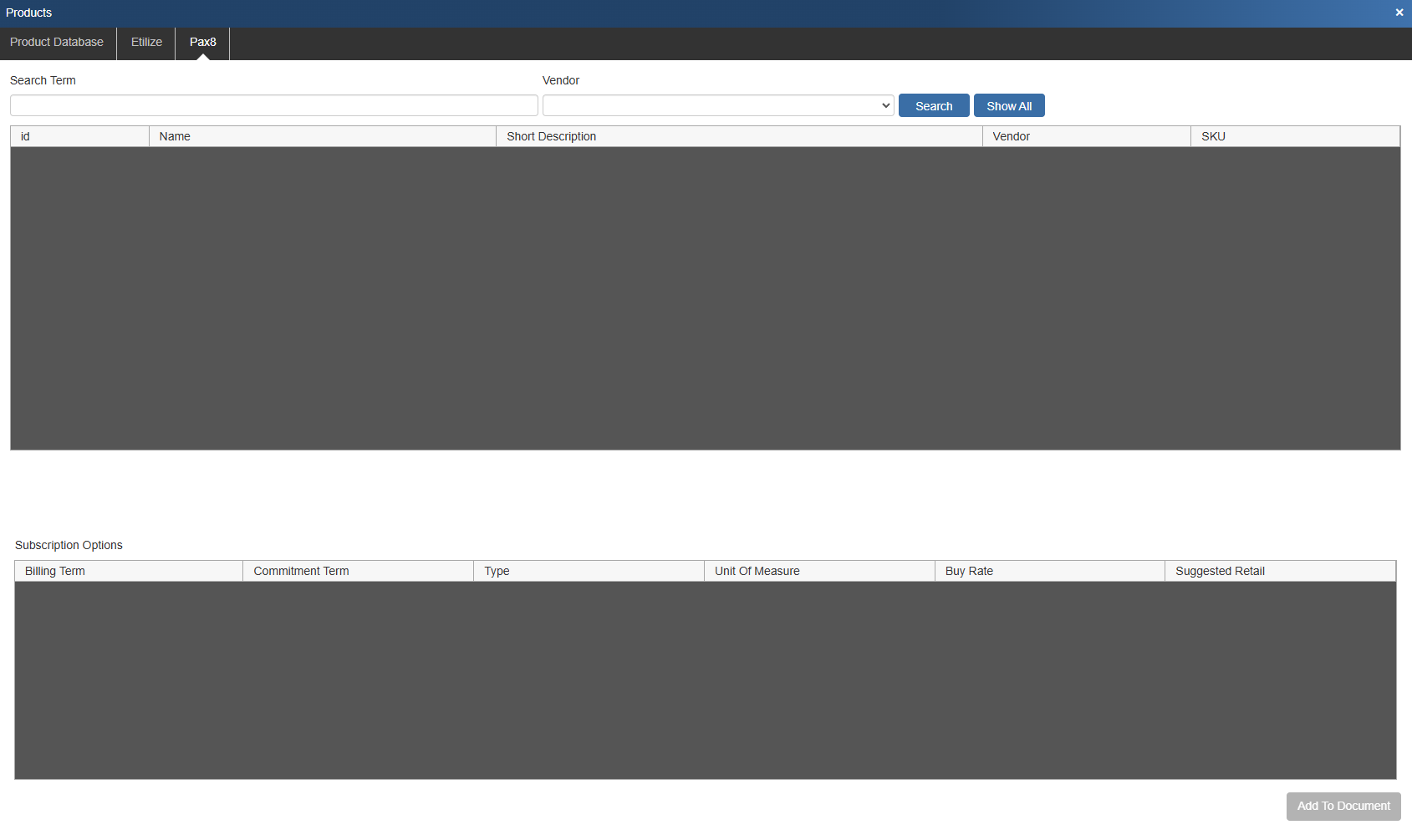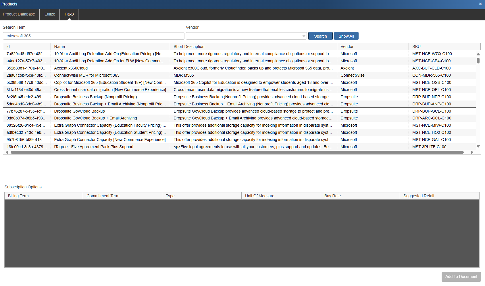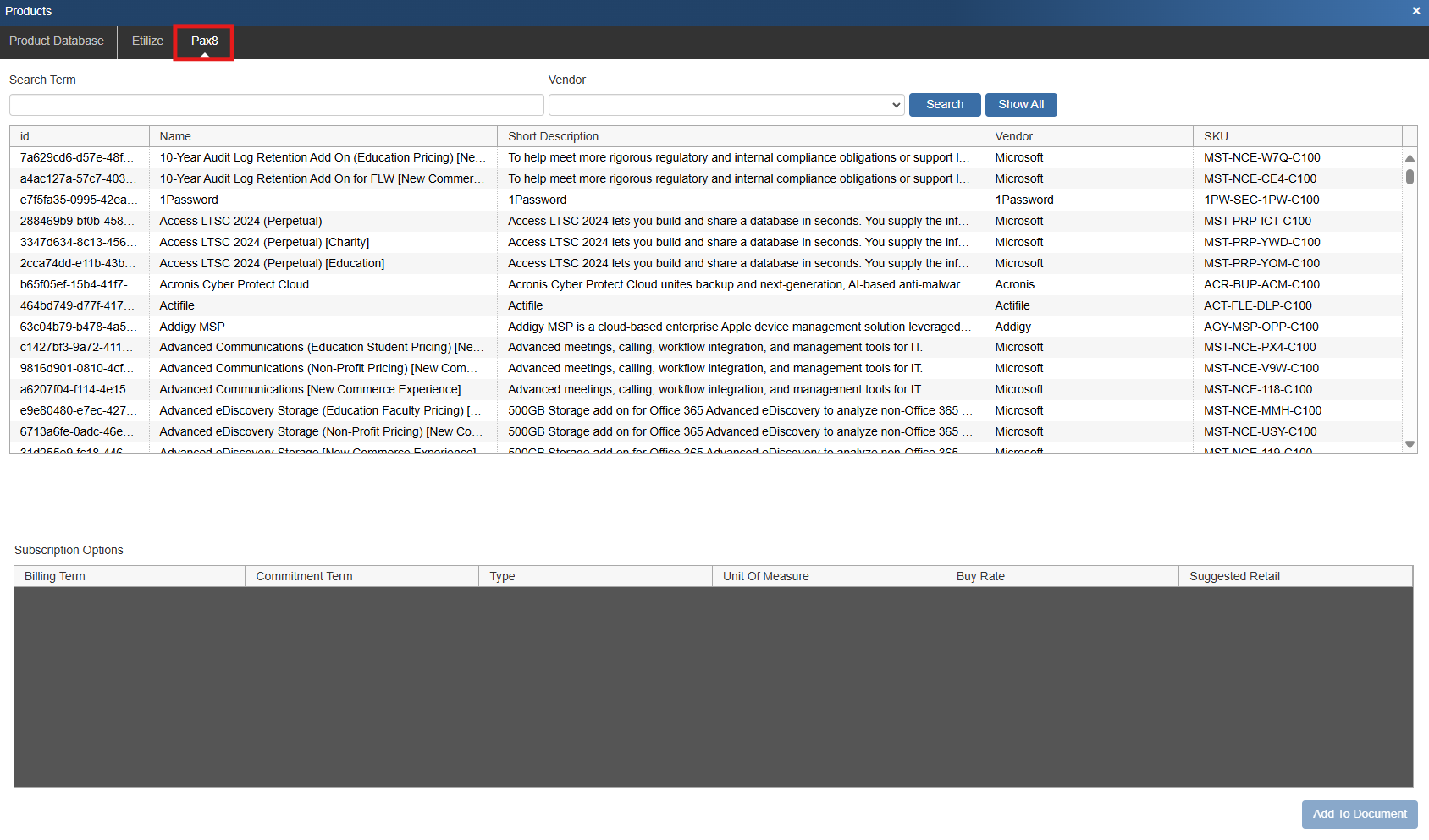 This opens the Search Pax8 window where you can search for items you wish to include on the quote. Here you can search the Pax8 database using a search term and you can filter results by vendor. Additionally, if you wish to see all items you can hit Show All.
