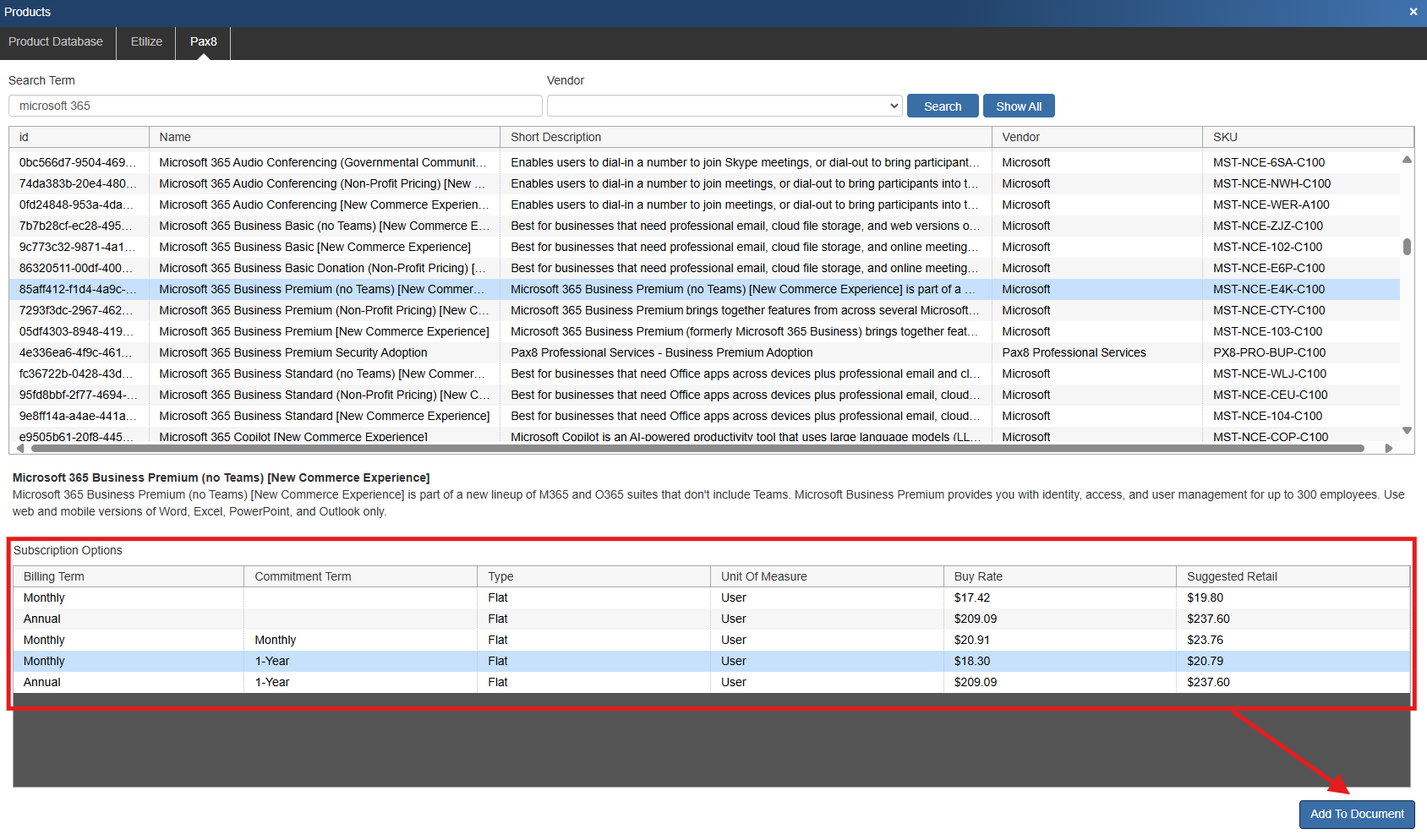 To add items to the quote select the item you would like to include, then select the Subscription Options along the bottom of the window. Once you have made your selections click Add to Document. This will add the item to the Document Items Tab.