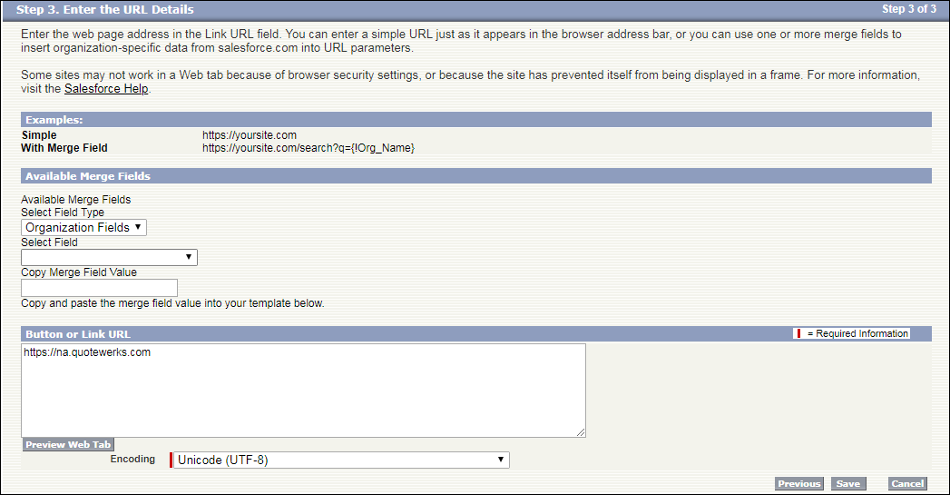 https://na.quotewerks.com. The merge fields are not required and can be left blank or as the default settings. Once you have added that URL field, you can click "Save".