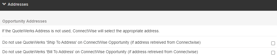 If you do not want ConnectWise Manage to use the Addresses selected in QuoteWerks in the Ship to and Bill to fields, you can select the options here.
