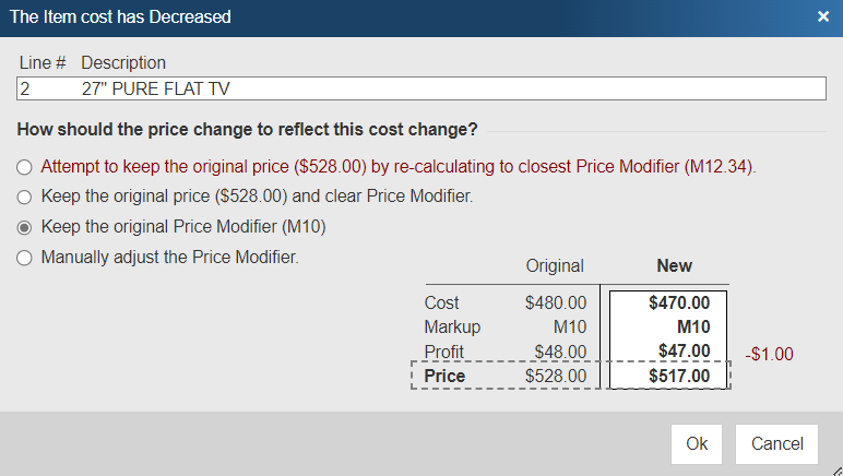 Select this option to maintain the same price that was previously quoted, by automatically adjusting the price modifier. Since some rounding is involved, the price will actually lower a couple of cents.