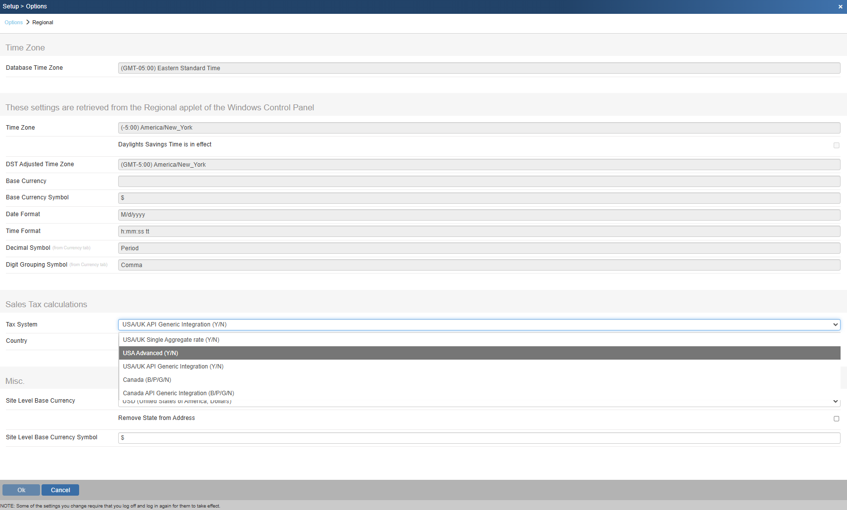 3) To use the Advanced Sales tax system go to the Regional section of the Setup->Options menu and choose "USA Advanced (Y/N)" from the Tax System drop down.