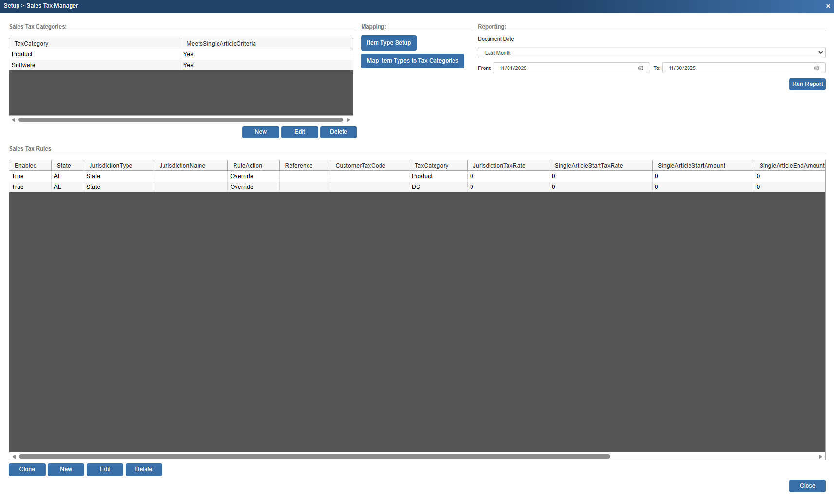 •Any time you change the tax rules (Under the Setup->Sales Tax Manager menu, you need to go re-select the tax using the [realtime tax rate] button because a static copy of the tax settings are always stored per document.