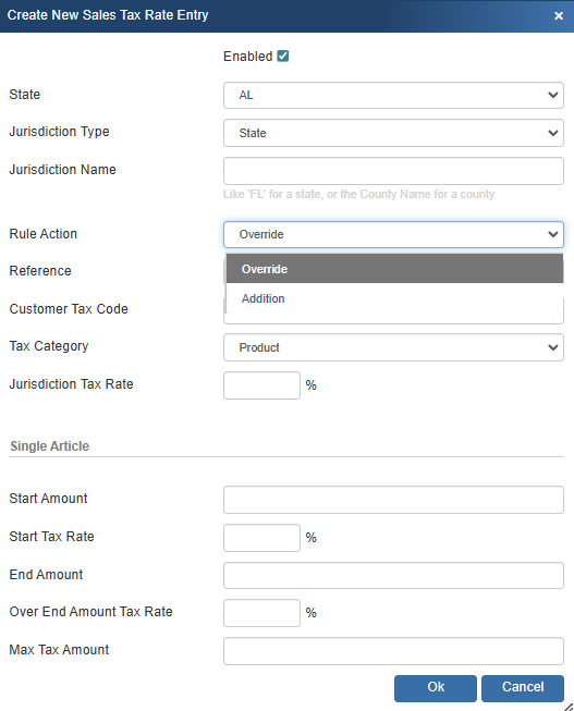If your state or county charges some kind of special tax that is not known to our tax table realtime feed, then you can manually add it here as an addition to charge an additional tax. A good example of this is for TN, the state collects 2.75% additional tax on single article sales between the amount of $1,600 and $3,200.