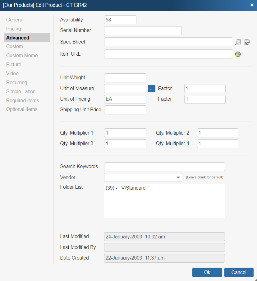Normally, the extended price of a product is calculated by multiplying the product quantity by the unit price. In certain cases, it may be useful to have more than one quantity value involved in the extended price calculation. Here you can set an item's default quantity multipliers when you need to use this feature.
