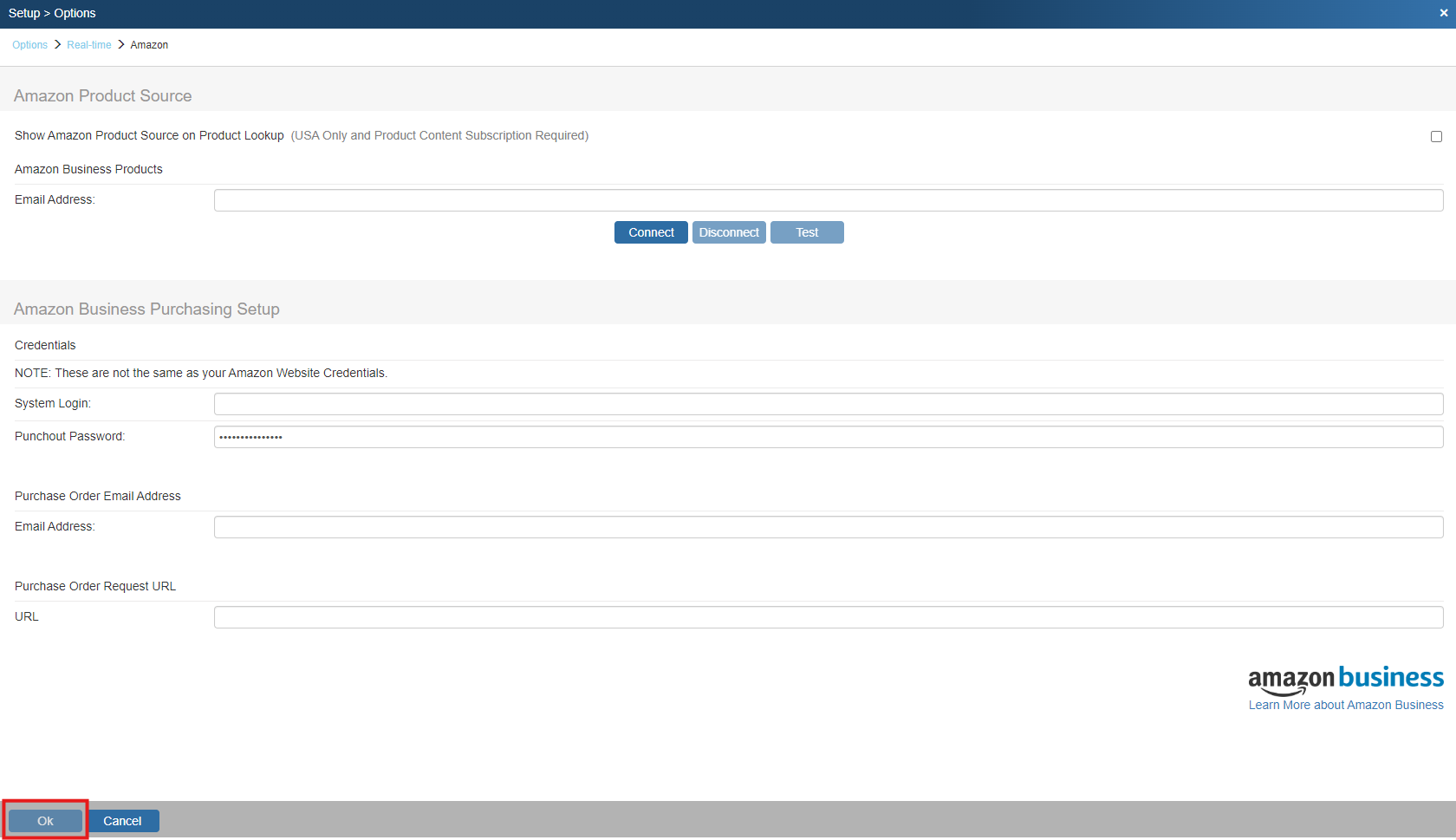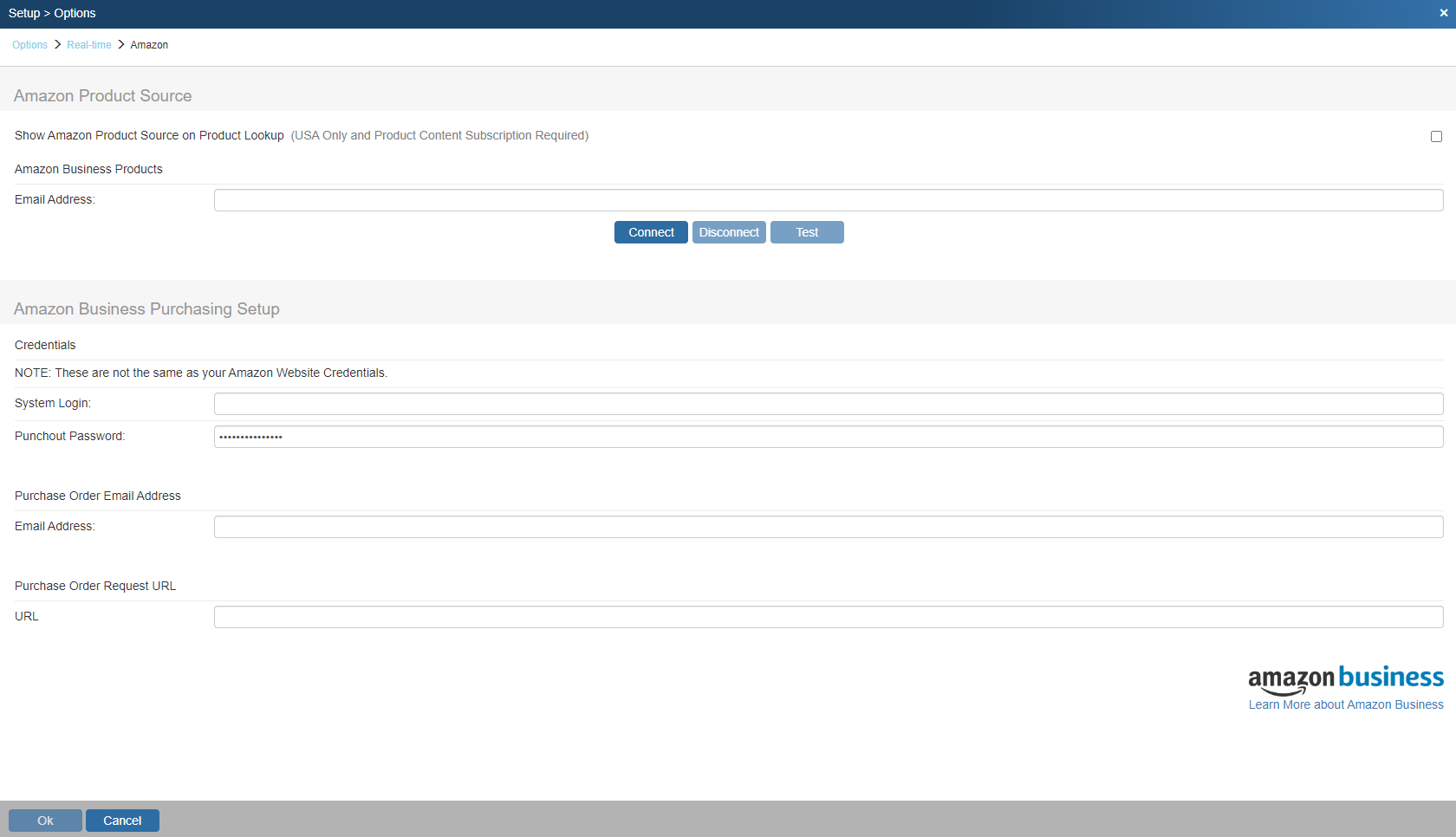 11. In QuoteWerks navigate to the Real-time Setup window by selecting Setup -> Options and selecting "Real-time". Paste the System Login, Password and the Purchase Order Request URL. Make sure you copy the Purchase Order Request URL NOT the Punchout URL into QuoteWerks.