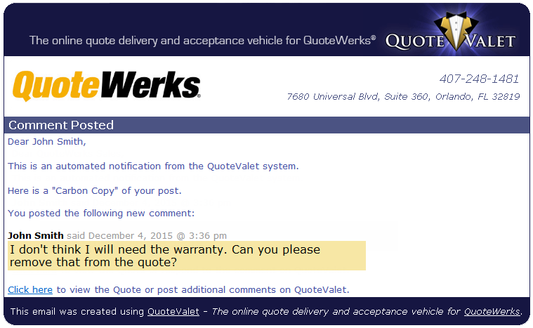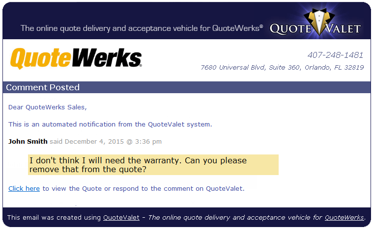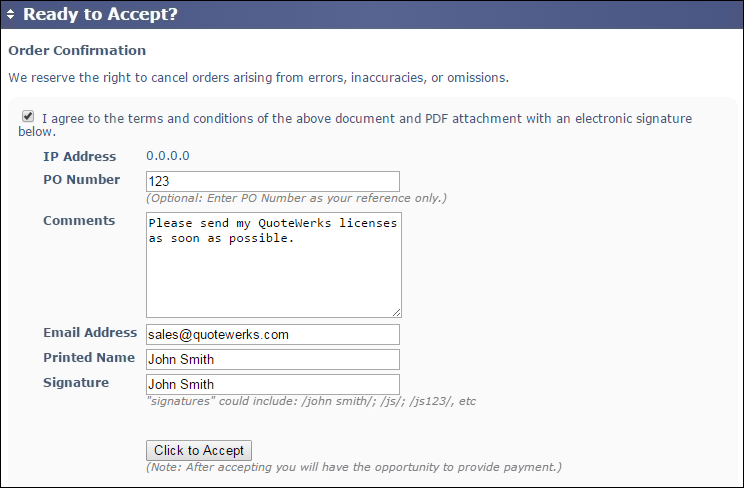 Here the customer can digitally sign the quote and accept the terms and conditions of the document from the QuoteValet.com quote. Once a customer clicks the “Accept Quote” button an email will be sent to the user informing them that the quote has been accepted. The user can also include a PO number to be written back into QuoteWerks as well as any comments related to the document. The comments will also be written back into QuoteWerks on the QuoteValet tab for that document.
