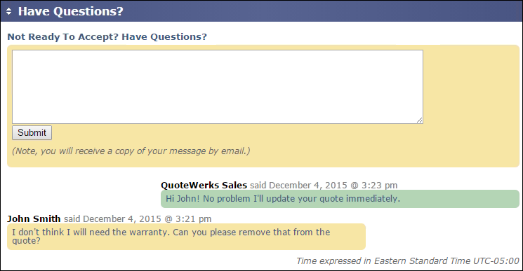 The last section of the document includes a questions area where customers can submit questions on the quote. An email will be sent to the user for each question asked by the customer notifying the user that a question has been submitted and will also include the question itself. Additionally, when the user responds the user’s response will be posted on the QuoteValet quote and an email will be sent to the customer notifying them that a comment has been posted.