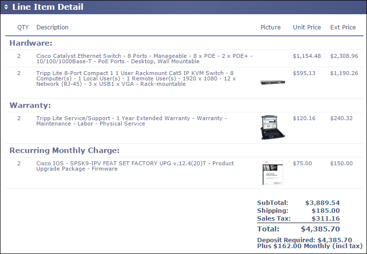 The second section of this quote includes the line items of the quote. This can include any kind of information such as the description, product pictures (if applicable), the pricing and the total price. Shipping and tax will also be reflected in the Grand Total and is detected automatically based on the tax settings in QuoteWerks.