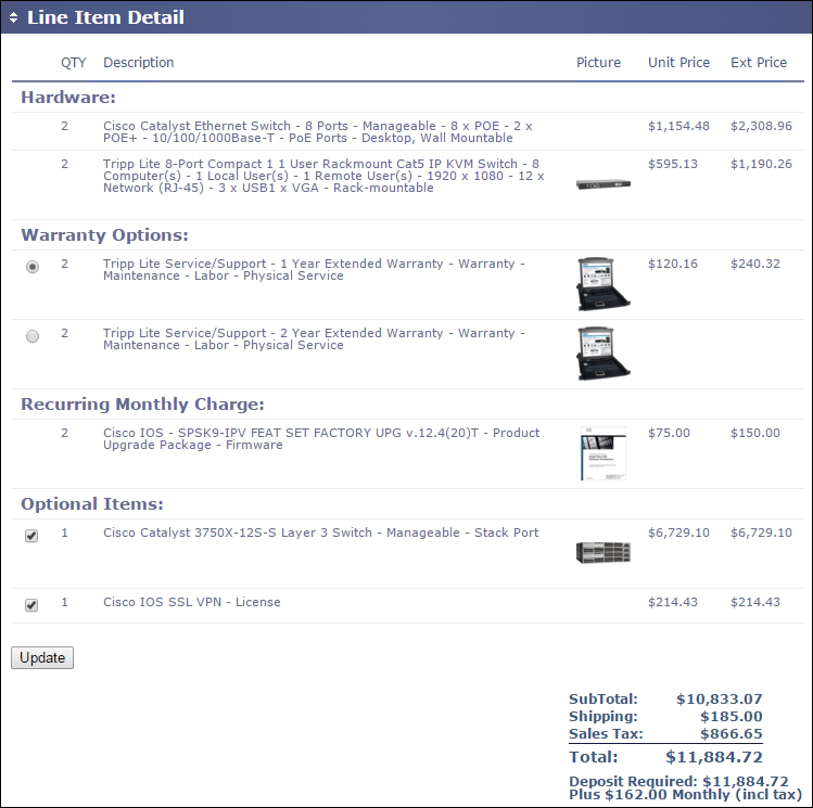 QuoteValet also supports mutually exclusive items as well as support for grouped items (bundles), headings, subtotals, percent charges and discounts.