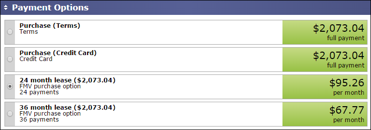 The Payments Options section will only appear if you have setup a payment option on the Sale Info tab. This section will list any payment options setup including credit card, terms, and any leasing options. Users can set default payment options in the Setup-> Options menu.