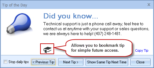 •Sixth, you can access the Help -> Tip of the Day menu. You can view as many tips as you'd like by clicking the [Next Tip] button. This menu has options to copy the tip to your clipboard and even bookmark your favorite tips. Hold down [SHIFT] on your keyboard and click [Next Tip] or [Previous Tip] to cycle through your bookmarked tips.