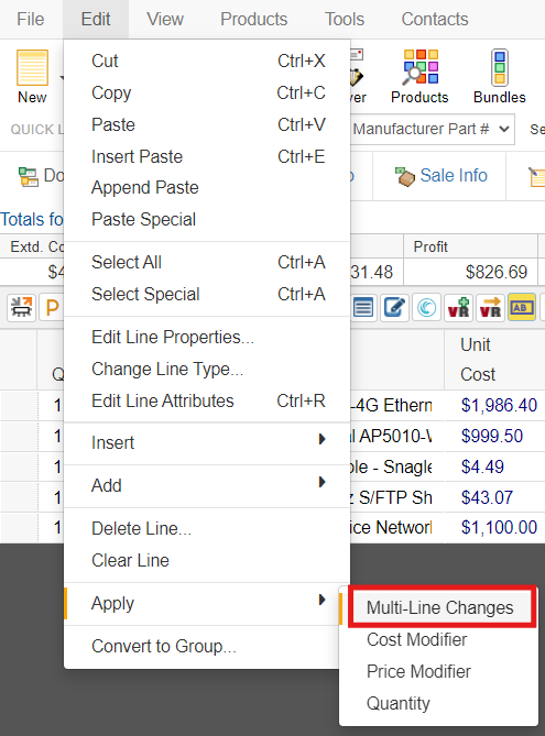 With one or more line items selected, you can select the Edit -> Apply Multi-Line Changes menu or right click and select Apply -> Multi-Line Changes.