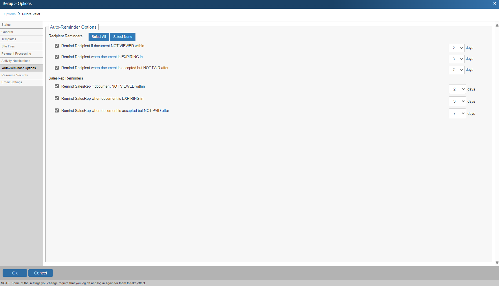 The Auto-Reminder Options tab is where users can set the default Auto-reminder settings for the installation. The Auto-reminders are automatically generated emails sent to the client and the SalesRep to remind them to view the document, let them know it is expiring, and also that an accepted quote still has a balance. The selections made will apply to all users who utilize QuoteValet. Users have the option to manually adjust the reminder settings on each document uploaded to QuoteValet. If no selections are changed, then the default selections will be used.