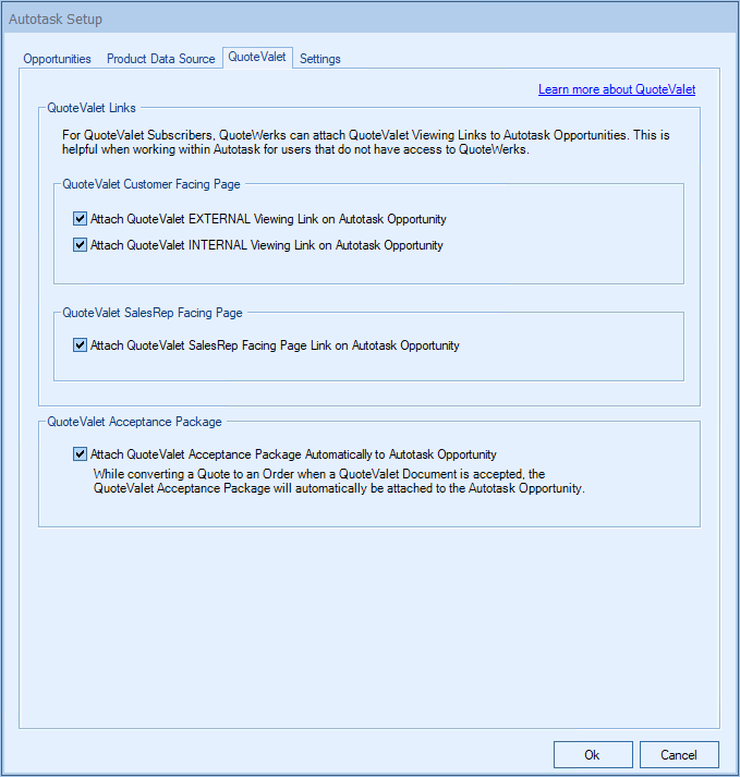 This checkbox will automatically upload and attach the QuoteValet Acceptance Package to the Autotask Opportunity when the QuoteValet quote is accepted and converted to an Order in QuoteWerks.