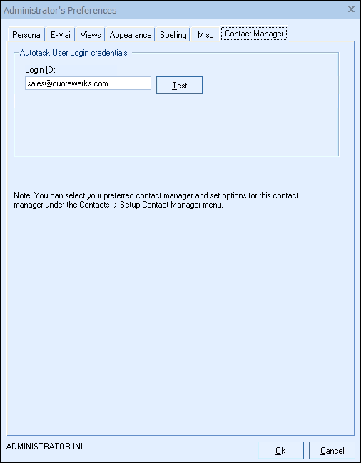 Each user will also need to enter in their Autotask user login credentials under their QuoteWerks user name after the Autotask integration is setup in the Tools > My Preferences > Contact Manager tab.
