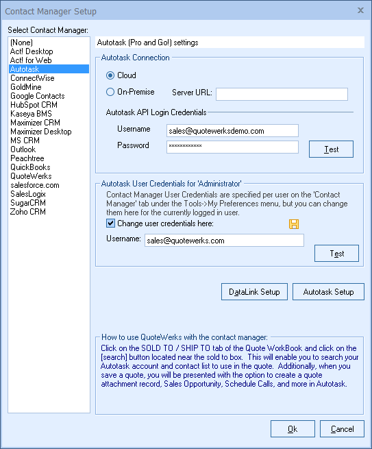 The following steps will take you through the process of configuring QuoteWerks for use with Autotask.