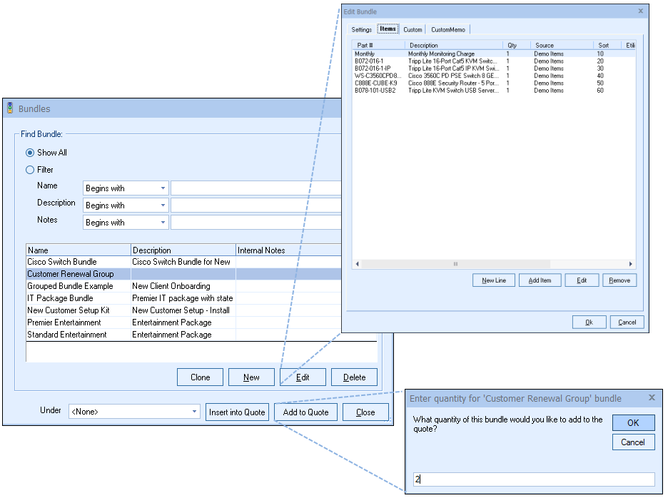 If you often quote groups of items at once, you will find the QuoteWerks bundling features very useful. You can create a bundle that includes all the items that you want to quote together and you can specify details like the quantity of each item that should be included in the bundle. With a bundle created, the next time you need to add that group of items to the quote, you can simply select the bundle and all the items in the bundle will be added to the quote. This saves you time by not requiring that you find and select each item, and it ensures that you will not forget to remember some of the items that are supposed to be in the bundle.