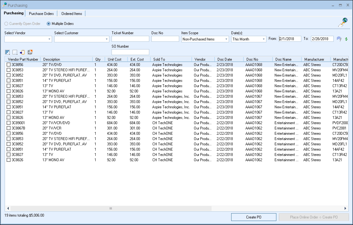 Purchasing is a feature available both manually and through the Real-time Module, which enables you to place orders electronically with the USA and Canadian divisions of D&H, the USA and Canadian divisions of Ingram Micro, and the USA and Canadian divisions of TD SYNNEX.