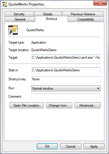 This shortcut then runs the actual QuoteWerks program file qw.exe. If you select your QuoteWerks shortcut or menu item, and right click and select the Properties menu, you will see on the Shortcut tab the command line used to start and run QuoteWerks. This is displayed in the “Target:” box: