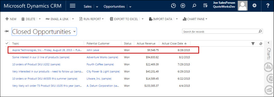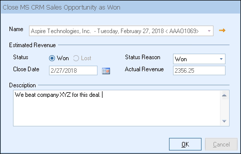 This completed sale can originate in several ways. First, if there is an existing sales opportunity for this quote, QuoteWerks will convert that existing sales opportunity into a ‘Closed as Won’ sale. If there is no existing sales opportunity and this option is checked, then QuoteWerks will create a new ‘Closed as Won’ sale. If the ‘Closed as Won’ sale already exists and you have made some changes to the order/invoice, unfortunately, QuoteWerks will not update the ‘Closed as Won’ sale in MS CRM unless you previously re-opened the opportunity in MS CRM.