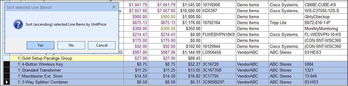 The DocumentItem columns can be sorted by by clicking on the column name. This will automatically prompt you to sort the columns by "Ascending". If you wish to sort by "Descending" instead, simply hold the SHIFT key before clicking on the column name. Users can also specify which columns to sort by pre-selecting them. For example, if you select 4 of the 16 line items in a document, only the selected line items will sort. Users can select both contiguous range of lines or single select lines to sort.