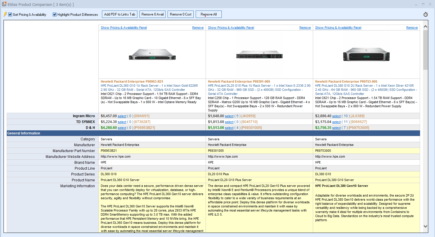 The Etilize Product Comparison Window displays the items in a table format with item attributes to make it easy for users to make a side-by-side comparisons of items from Etilize. You can compare up to 15 items at once (depending on monitor size). This feature is part of the QuoteWerks Product Content Subscription. Etilize Product Comparison is available for all Etilize-based real-time distributors including Jenne (USA), Ingram Micro USA and Canada, SYNNEX USA and Canada, Tech Data USA and Canada, D&H USA and Canada, as well as Westcon/Comstor USA and Canada and ASI USA. The UK distributors supported include Ingram Micro, Northamber, Tech Data, and Westcoast. Ingram Micro Australia and Dicker Data (Australia) are also supported for the Comparison Window.