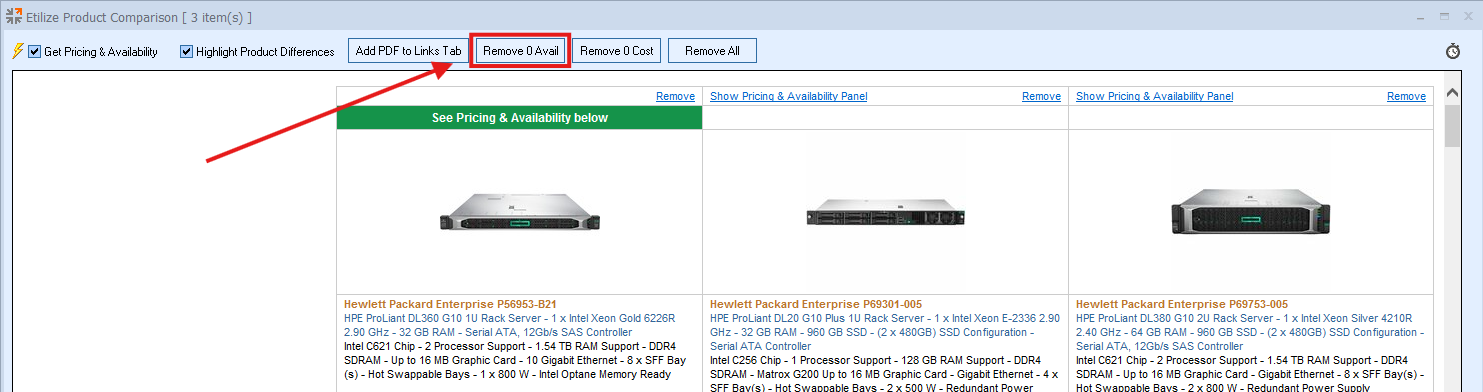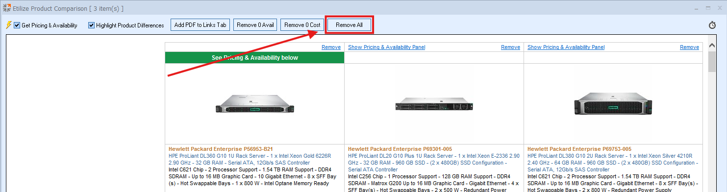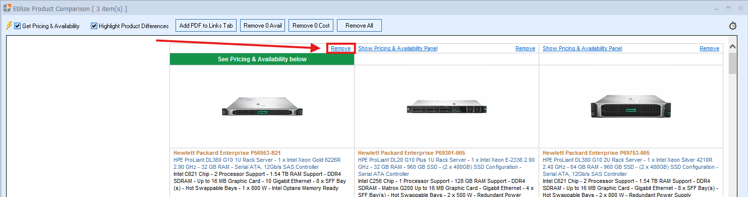 The [Show Pricing & Availability Panel] hyperlink and the [Remove] hyperlink also available at the very bottom of the comparison window.