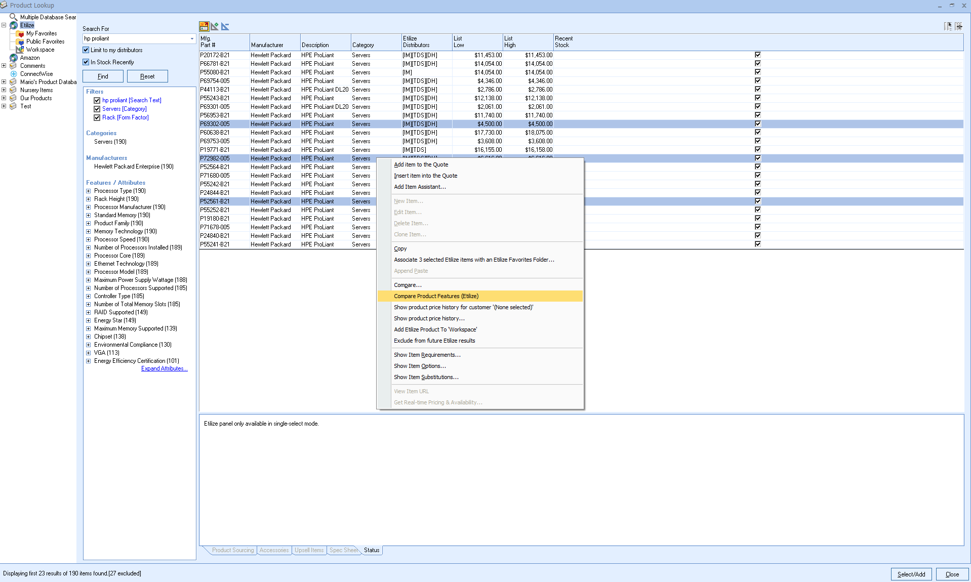 To add multiple items to the Comparison Window at one time, hold the CTRL and highlight multiple items by clicking on them. Once you have highlighted all the items you would like to compare, right-click and click on Compare Product Features (Etilize).
