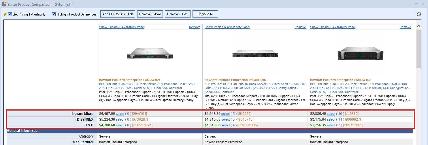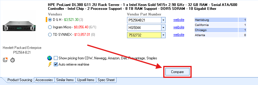 This checkbox will display the real-time pricing and availability across all the items in the comparison window so you can check pricing on all items at once. Similar to the Product Sourcing Panel, the best cost will be highlighted in green. If you would like to add an item to your quote, simply click on the item's price or the [select] hyperlink and the item will be added to your quote. Additionally, the vendor part number is also hyperlinked and when clicked will open the vendor website for you to review the item there as well. If an item is pulled from the Part Locator, a bulls-eye icon will appear next to the item's price.