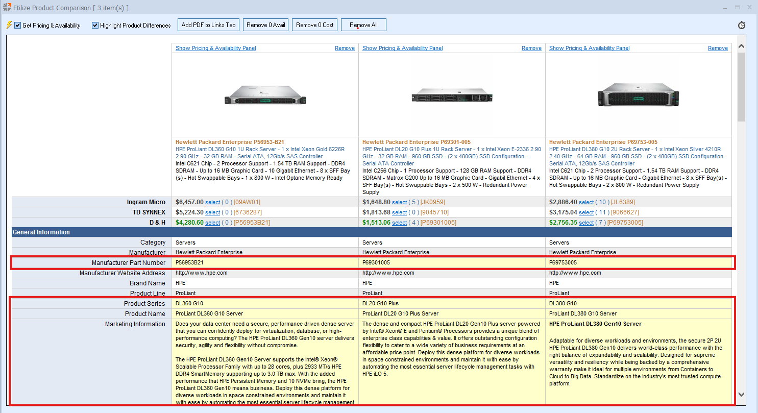 This checkbox will highlight any differences between items in yellow. For example, the manufacturer part number will be different for these items, so it will be one of the fields highlighted when we apply that selection.