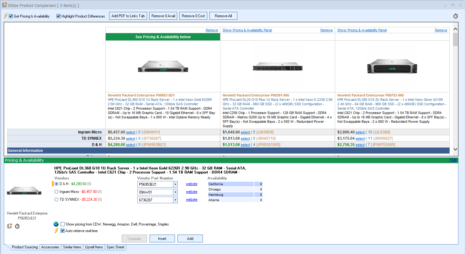 Accessing the Product Sourcing Panel window from the Etilize Product Comparison Window is especially useful if you want to compare accessories, similar, or upsell items from a selected item. You can also add items from this panel to your quote by using the [Insert] and [Add] buttons. You can hide this panel by clicking on the [Hide] hyperlink on the top right of the panel.