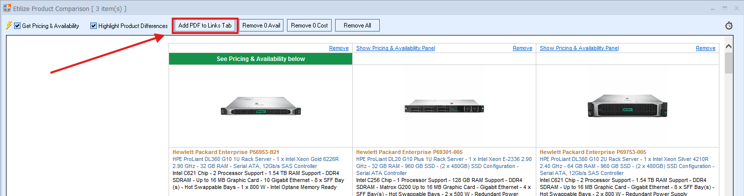 The [Add PDF Links to Links Tab] button will take all the items in the comparison window and add them to a PDF file that is then attached to the Links tab on the Quote WorkBook. This PDF can then be sent to the customer so they can see the differences between the items from the comparison window. As with the Etilize Spec Sheet PDF, this obeys the option to not include the ManufacturerPartNumber if that option is set.