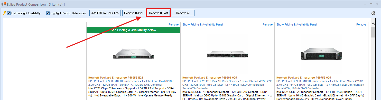 After retrieving the real-time price and availability, the [Remove 0 Cost] button will remove any results in the Comparison Window that have the cost of zero for all distributors to help de-clutter and remove results that are not useable from the search results.