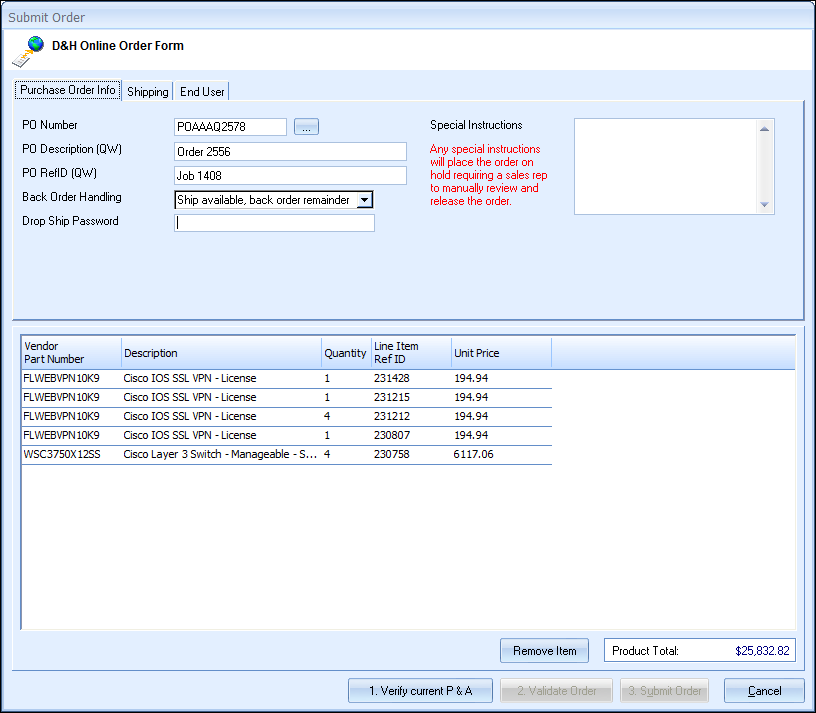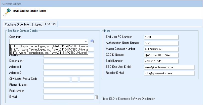 Note: When you submit the D&H electronic order, the Ship To information entered into the online order will be saved in the QuoteWerks purchase order. |