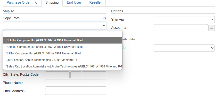 If you selected to order items from the currently open order, when you click the [Copy from] menu button you will have the option to pull from the ‘Ship To’, ‘Sold To’, ‘Bill To’, ‘Sales Rep Location’ and ‘Our Location’ areas in QuoteWerks.
