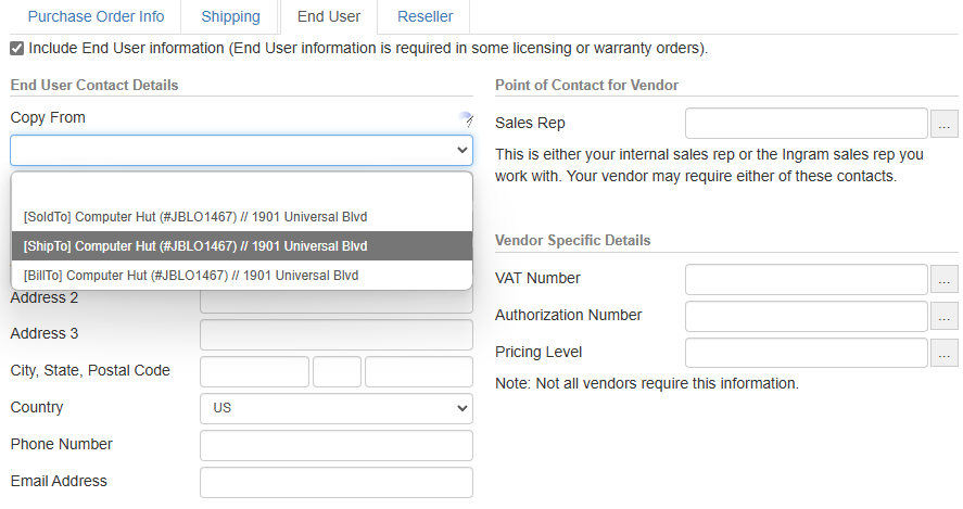 Note: When you submit the Ingram Micro electronic order, the Ship To information entered into the online order will be saved in the QuoteWerks purchase order. |