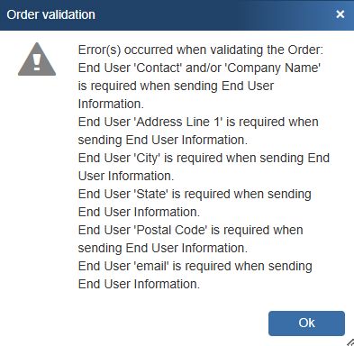 If an item requires End User information and it is not provided on this tab, you will receive an error when you attempt to submit the order: