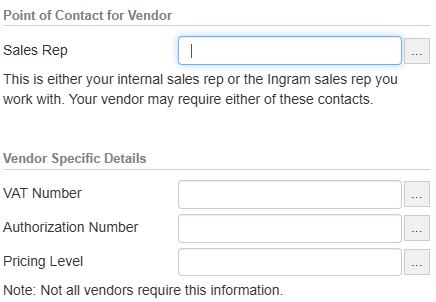 The vendor that you are ordering items from may require Sales Rep contact information. This field will either be your internal sales rep or the Ingram Micro sales rep you work with. You can also predefine a list of sales reps by clicking on the