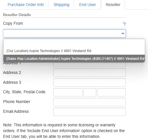 This tab provides fields to supply Reseller contact details for the order. These are typically only necessary in situations where the product being ordered is a software license or warranty that requires the Reseller’s details. The Reseller for an order will typically be your company.
