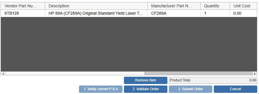 This section of the Online Order Form displays the line items that you have selected to order. You may remove an item from the list by selecting it and clicking the [Remove Item] button.