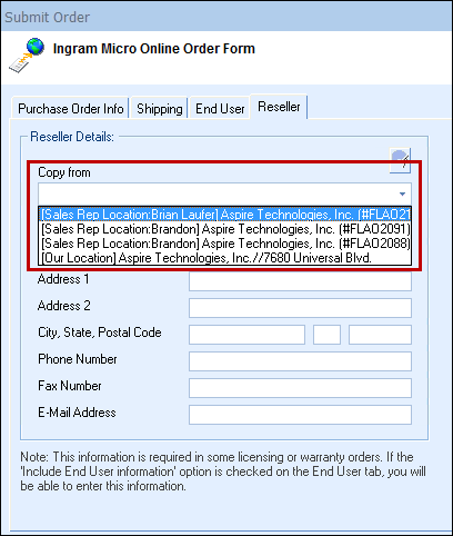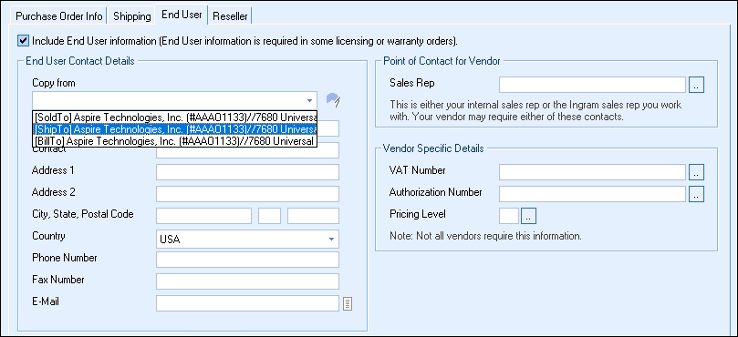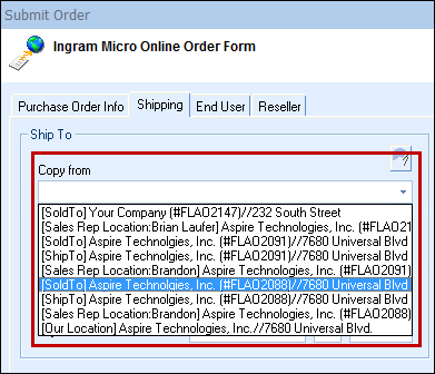 Note: When you submit the Ingram Micro electronic order, the Ship To information entered into the online order will be saved in the QuoteWerks purchase order. |